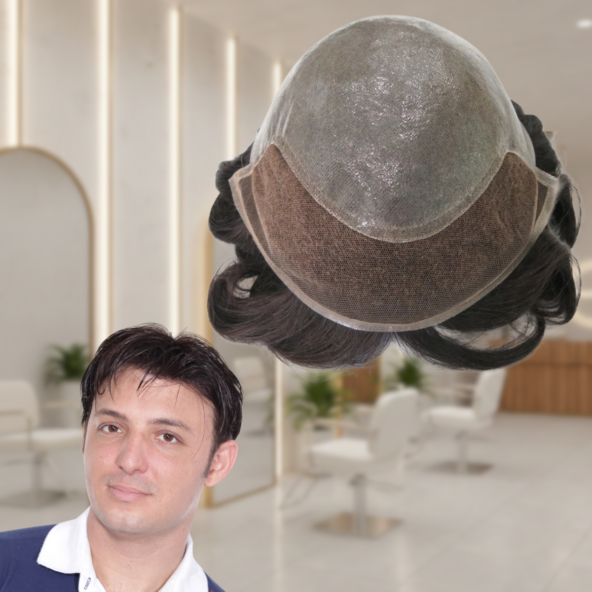 A prótese é confeccionada com cabelos humanos de alta qualidade, na cor castanho escuro e com 20% de fios grisalhos.