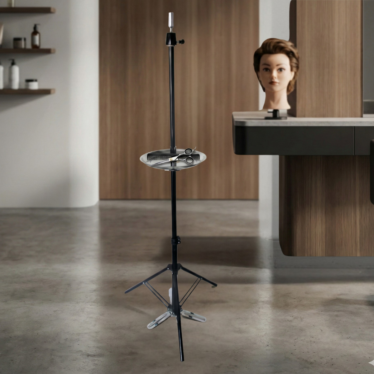 O Tripé para Cabeça de Treino tem seu modelo em aço e com bandeja  é uma ferramenta de alta qualidade e durabilidade, projetada para praticantes de cabeleireiro, sejam estudantes de salão ou usuários domésticos. Possui altura ajustável e é acompanhado por uma bolsa preta em tecido para facilitar o transporte. Fabricado em aço inoxidável, proporciona resistência e força, tornando-o ideal para diversas práticas de cabeleireiro, como corte, definição e trança.